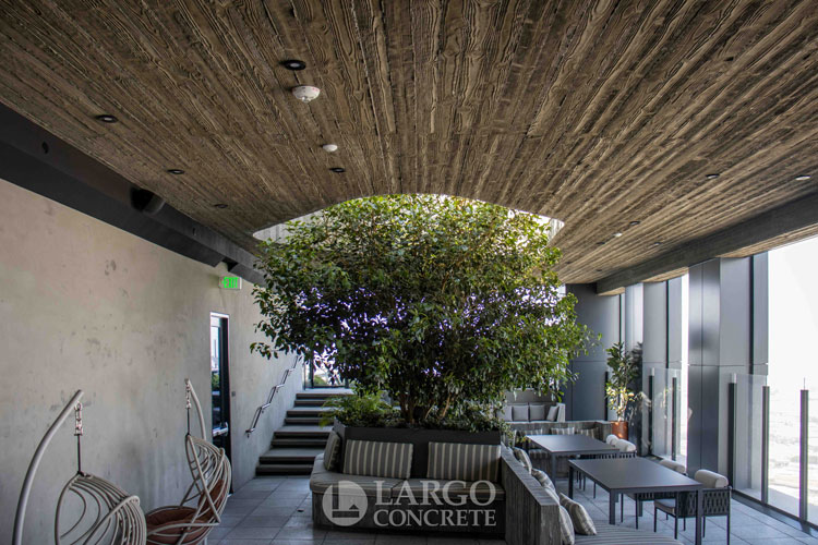 Decorative board-formed, exposed architectural concrete can be found throughout the development. From the main lobby soffit to the residential and office columns, to the sauna and cabanas at the roof deck pool, the finish is prominent throughout. The most striking board-formed features is the amoeba-shaped void in the roof deck referred to as the ‘Oculus.’ Each plank was prepared, sealed and used once for the highest quality finish and then repurposed as toe boards and for other safety measures to reduce waste.